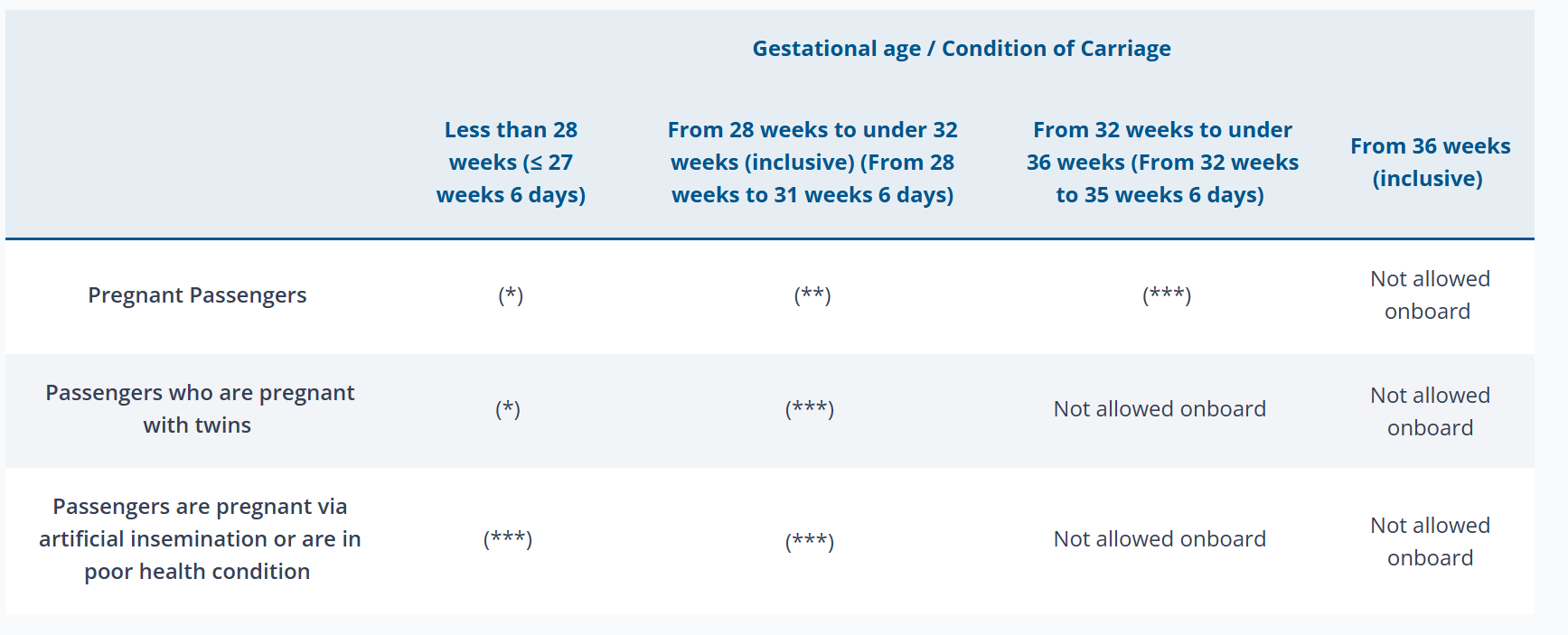To ensure maximum comfort and safety, pregnant passengers need to inform Bamboo Airways of their gestational age during booking, and during check-in to receive necessary consulting and assistance. Pregnant passengers with pre-consiting conditions are also advised to seek medical consultation from doctors before travelling by air. Please find our detailed guidelines regarding pregnant passengers in the below table
